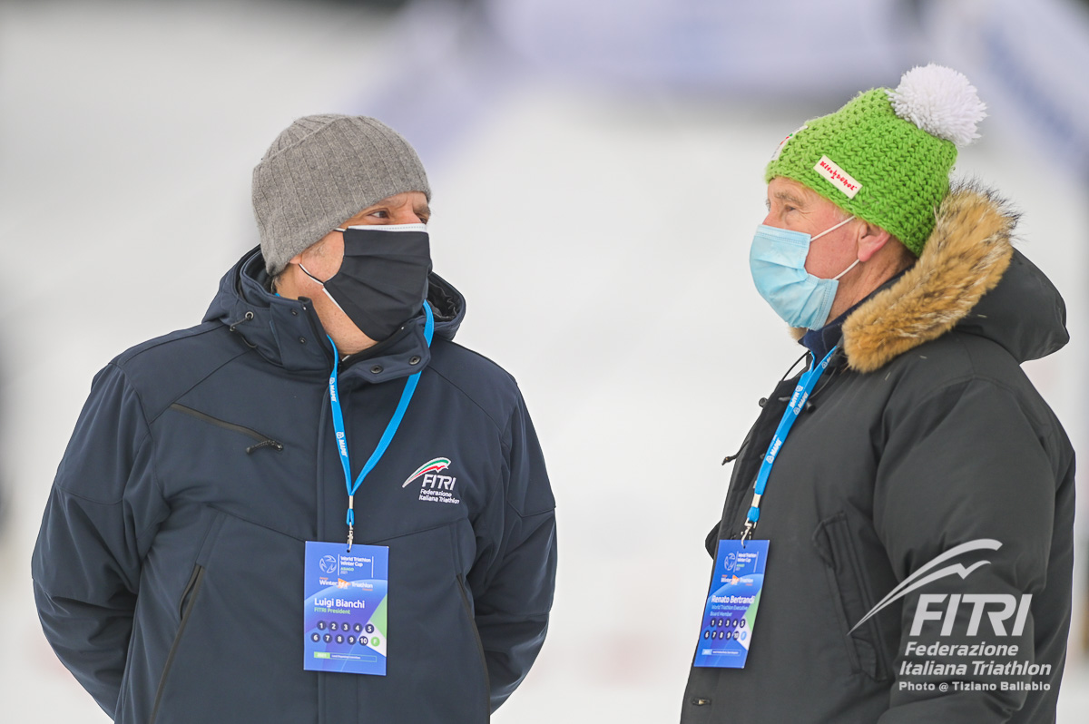 (Renato Bertrandi, sulla destra, con il presidente Bianchi in occasione della World Triathlon Winter Cup di Asiago di quest'anno)