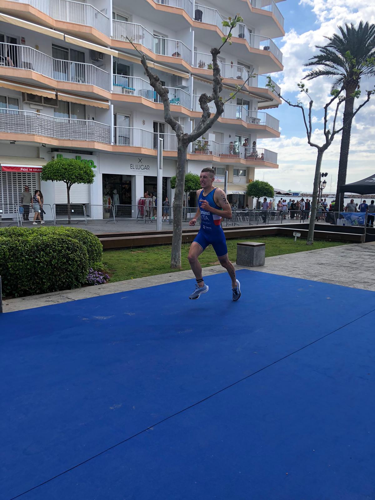 La veloce gara sull'isola delle Baleari a Santa Eulalia vede tra gli uomini prendere subito il comando il duo ungherese Gergő Dobi, Márton Kropkó e lo spagnolo Cristian Fernandez Nieto a pochi secondi Jimmy Lund (GBR) e Michele Bortolamedi che escono dal nuoto in testa ad un gruppo allungato di una decina di atleti. Cambio veloce con Fernandez Nieto, Kropkó e Lund a scappar via, Dobi e Bortolamedi a pochi secondi e Christopher Perham in recupero. Fernandez Nieto allunga e vince, recupero determinate nella corsa del britannico Perham che arriva secondo e terzo il connazionale Lund. Bortolamendi chiude 8°, Angelini 15°.
